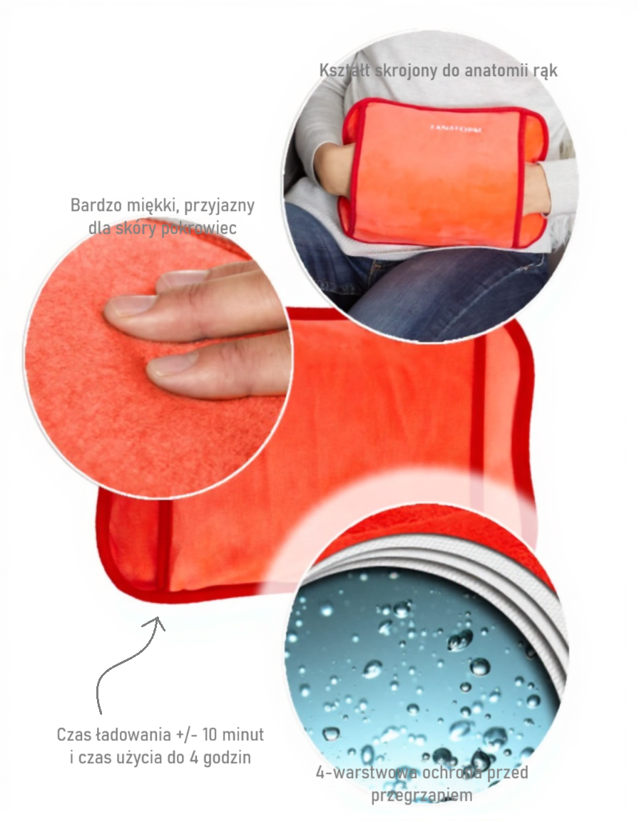 Wielofunkcyjność – choć zaprojektowany głównie jako ogrzewacz dłoni, sprawdzi się także jako poduszkę grzewczą na plecy, kark, brzuch czy nogi — idealny przy chłodzie, bólu mięśni czy napięciu.