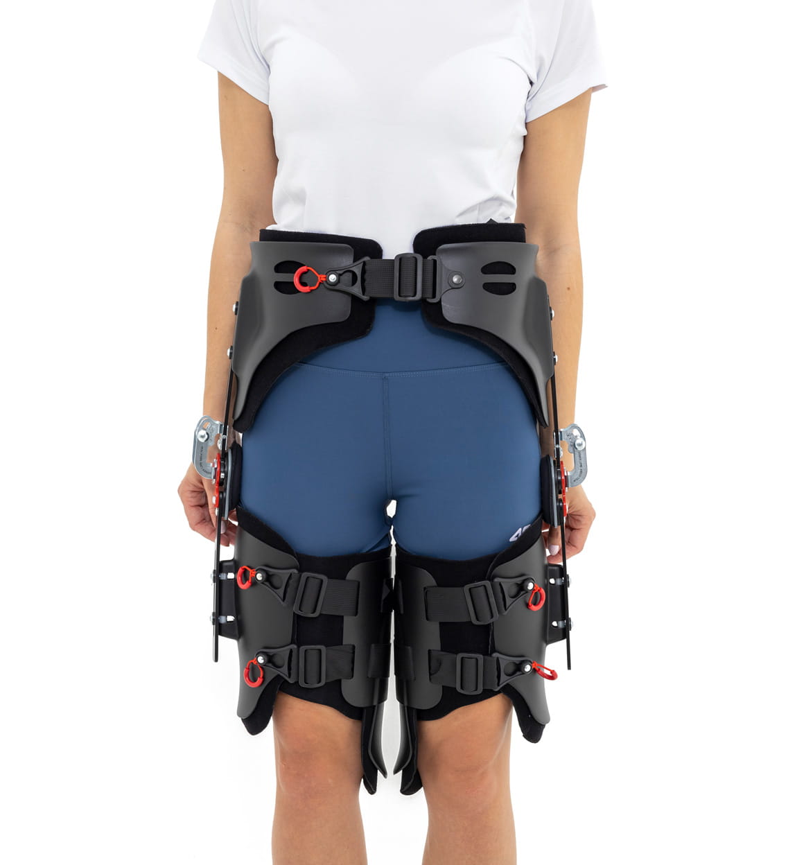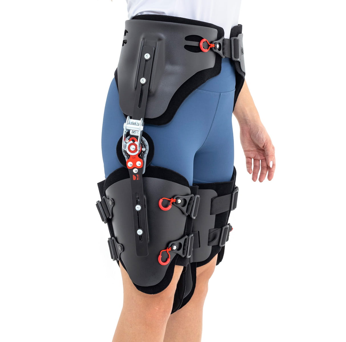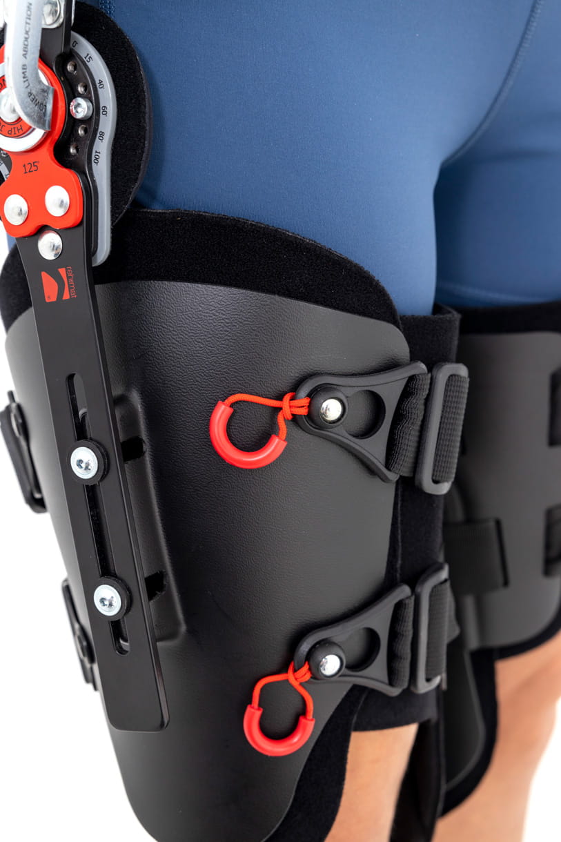 W części biodrowej ortezy zastosowano peloty z tworzywa sztucznego wyposażone w zapięcia rzepowe oraz przelotki dwóch taśm obwodowych. Natomiast, w jego części udowej zastosowano peloty z tworzywa z dwoma przelotkami taśm obwodowych.