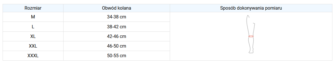 Rozmiar dobierany jest według obwodu kolana. Orteza pasuje zarówno na prawą jak i lewą nogę.