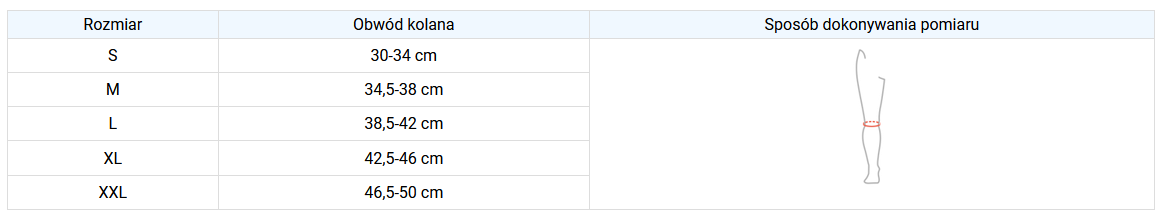 Rozmiar dobierany jest według obwodu stawu kolanowego. Orteza jest profilowana i pasuje na prawą lub lewą nogę.