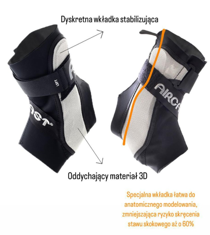 To oryginalna amerykańska orteza stawu skokowego marki AirCast firmy DonJoy. Stosowany przez wielu wielkich zawodników, takich jak Andy Murray, zapewnia doskonałą stabilizację stawu skokowego nawet w trakcie wzmożonej aktywności fizycznej.