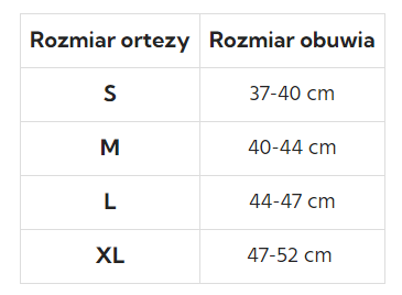 Orteza dobierana jest według standardowego rozmiaru obuwia. Orteza jest anatomicznie wyprofilowana i pasuje na prawą lub lewą nogę.