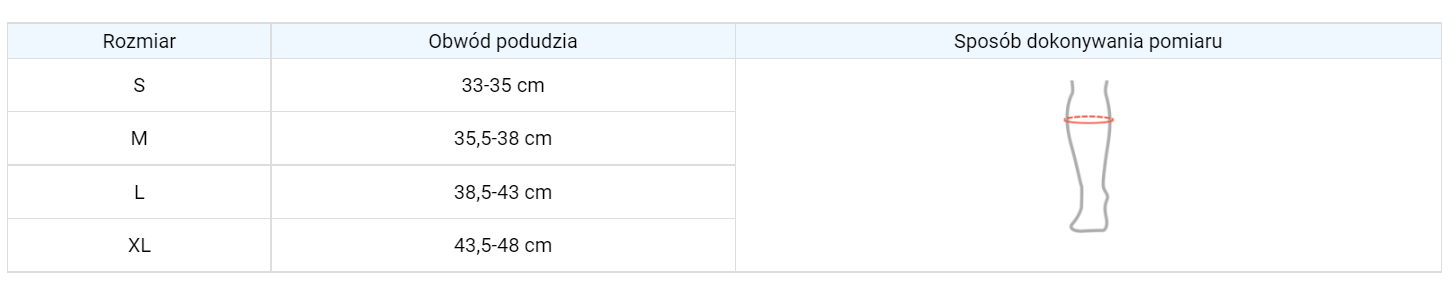 Rozmiar ortezy dobierany jest według obwodu łydki w jej najszerszym miejscu. Orteza pasuje zarówno na prawą jak i lewą nogę.