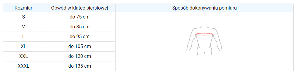 Rozmiar kamizelki Dessaulta dobierany jest wg obwodu klatki piersiowej. Produkt jest uniwersalny i pasuje zarówno na prawą jak i lewą rękę.