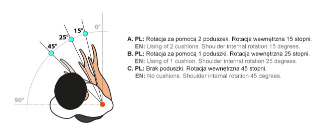 W zależności od zastosowania, orteza barku AM-SOB-06 zapewnia 3 stopnie rotacji wewnętrznej:
