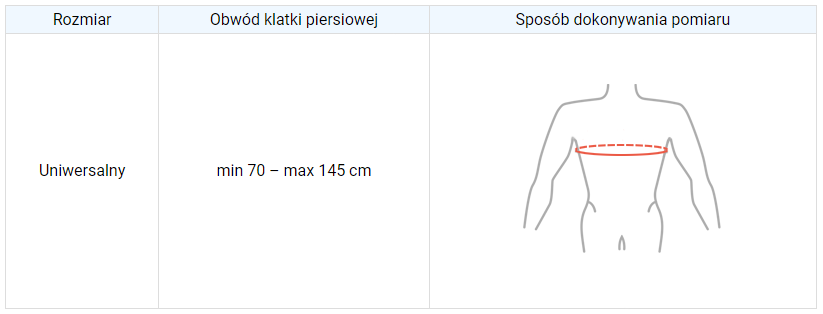 Właściwości samoszczepne produktu pozwalają na jego wykonanie w rozmiarze uniwersalnym. Dodatkowo, do produktu dołączyliśmy specjalny element przedłużający, którego przypięcie pozwala na osiągnięcie doskonałej kompresji i stabilizacji nawet przy dużych obwodach pacjenta.