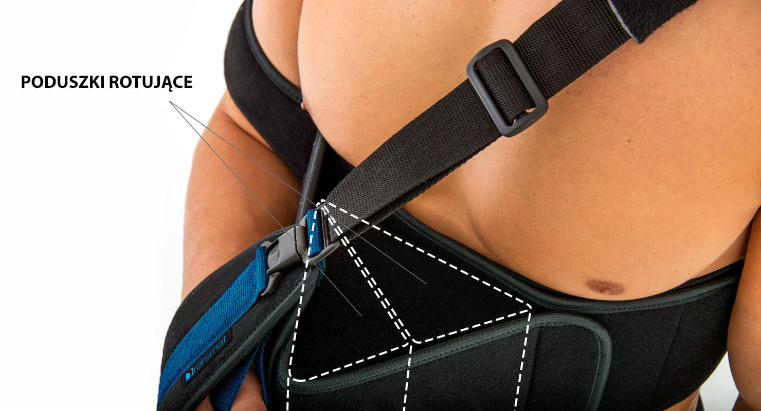 Orteza barku AM-SOB-06 to zaawansowany produkt medyczny. Orteza została wyposażona w dwie poduszki rotujące, których zastosowanie pozwala na płynną regulację stopnia rotacji barku.
