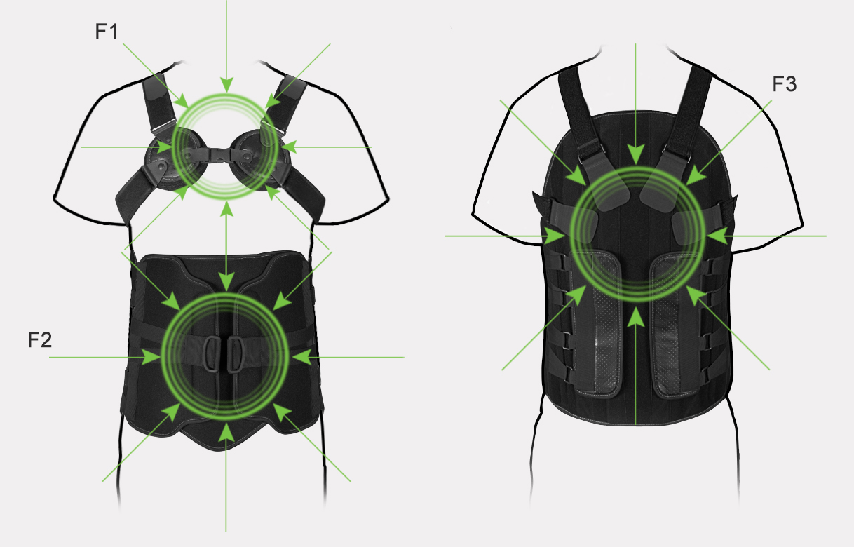Orteza TLSO tworzy 3-punktowy układ sił, na które składają się skierowane ku tyłowi z powierzchni mostka (F1) i okolic łonowych (F2) oraz siła skierowana ku przodowi z odcinka lędźwiowo-piersiowego kregosłupa (F3). Stworzone w ten sposób ciśnienie wymusza postawę przeprostną, zwiększa lordozę lędźwiową kręgosłupa oraz ogranicza jego ruchy boczne i obrotowe w płaszczyźnie strzałkowej, czołowej i poprzecznej.