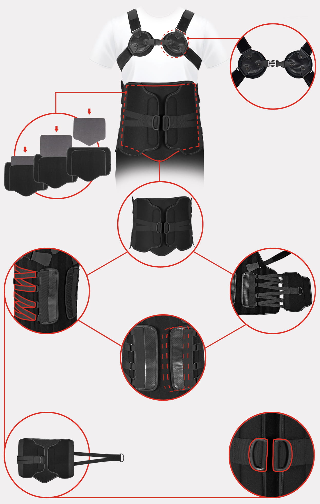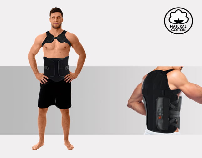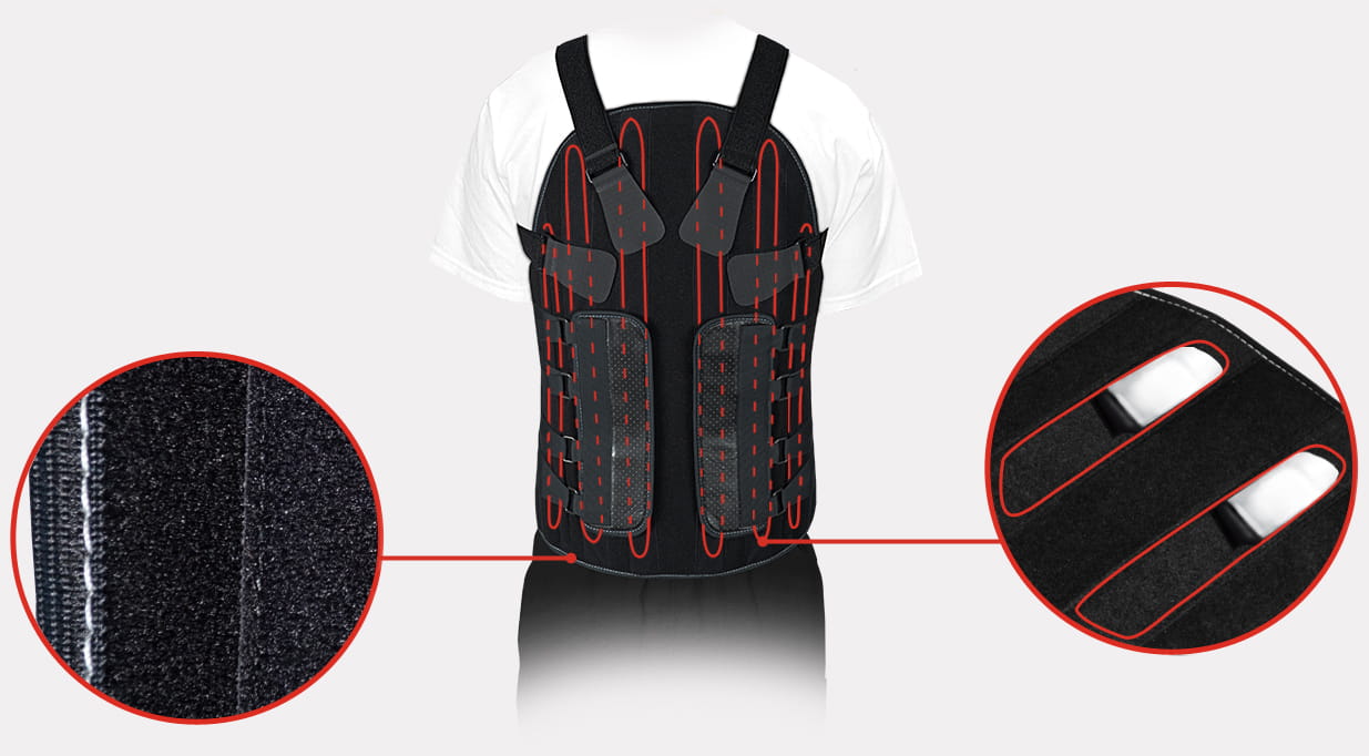 Gorset zapewnia full-obwodowe sztywne wsparcie kręgosłupa, od odcinka piersiowego (rejon łopatek T2/T3) w dół, aż do odcinka krzyżowego (S1).