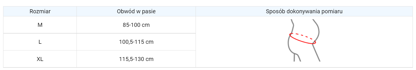 Zapięcia wyrobu wykonano w asymetryczny sposób, co pozwala na lepsze dopasowanie wyrobu do ciała pacjenta w zakresie jednego rozmiaru.