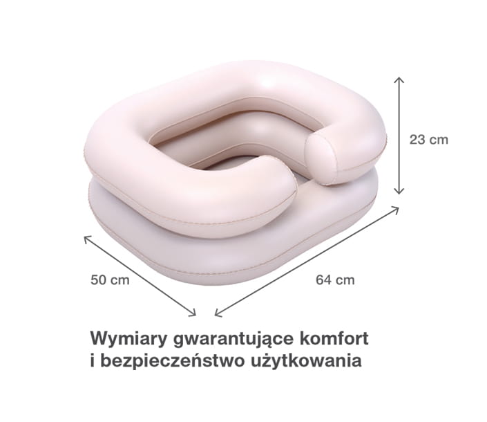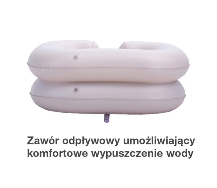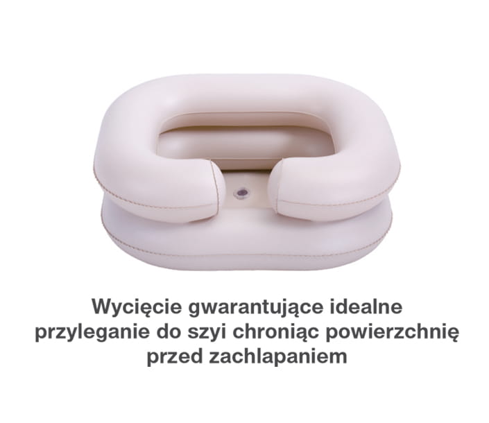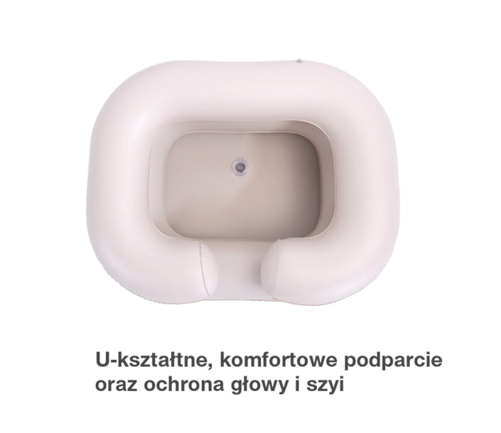 Specjalny kształt pompowanego basenu wraz z wycięciem na szyję zapewnia niezwykły komfort użytkowania. Wycięcie ułatwia oparcie głowy osoby chorej oraz zapobiega zachlapaniu wodą poduszki, pościeli czy łóżka.