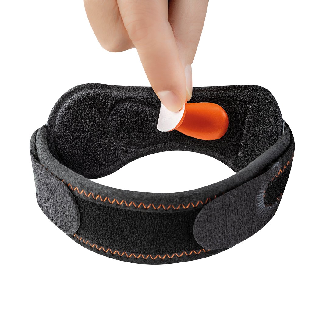 Opaska podrzepkowa wykonana została z miękkiego materiału typu welur. Zapinana jest z dwóch stron na micro-velcro co pozwala na łatwe i szybkie założenie. Silikonowe, anatomicznie wyprofilowane podparcie okolicy więzadła właściwego rzepki może być zdjęte dzięki mocowaniu na micro-velcro. Szersza tylna część podudziowa zapewnia właściwe trzymanie się opaski podczas skoków oraz biegania. Elastyczne łączenie taśmy dociągowej z częścią przednią ortezy zapewnia komfort podczas jej stosowania.