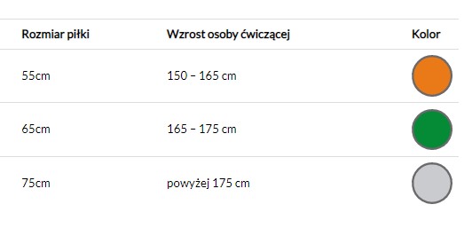 Piłka dostępna jest w 3 rozmiarach, dobieranych do wzrostu użytkownika, i adekwatnych kolorach: