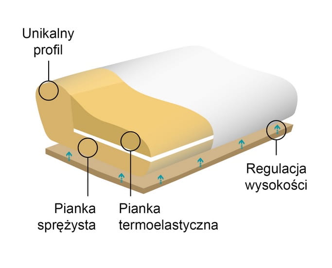 - Pianka sprężysta zapewnia dobre podparcie kręgosłupa szyjnego - zalecana przy dolegliwościach, wynikających z nieprawidłowej pozycji podczas snu oraz zwyrodnień kręgów szyjnych
