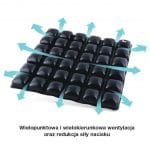 Specjalny przewiewny pokrowiec z suwakiem wykonany został z materiału siatkowego Mesh z antypoślizgowym spodem. Wyposażona została w rzepy umożliwiające zamocowanie poduszki np. na wózku inwalidzkim.