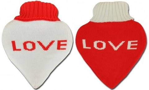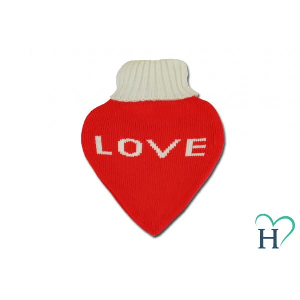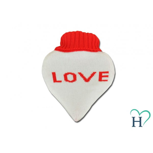 Gumowy termofor schowany jest w dyskretnym, dzianinowym pokrowcu w kształcie serca z napisem LOVE.