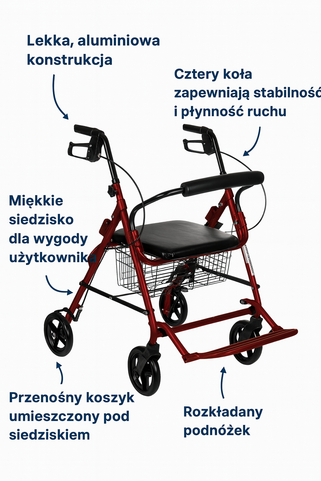 To czterokołowy balkonik z siedziskiem, który został stworzony z myślą o osobach z ograniczoną sprawnością ruchową, potrzebujących wsparcia przy wstawaniu, staniu i chodzeniu. Doskonały zarówno do użytku w pomieszczeniach, jak i na zewnątrz — wspomaga samodzielność w wielu codziennych czynnościach.